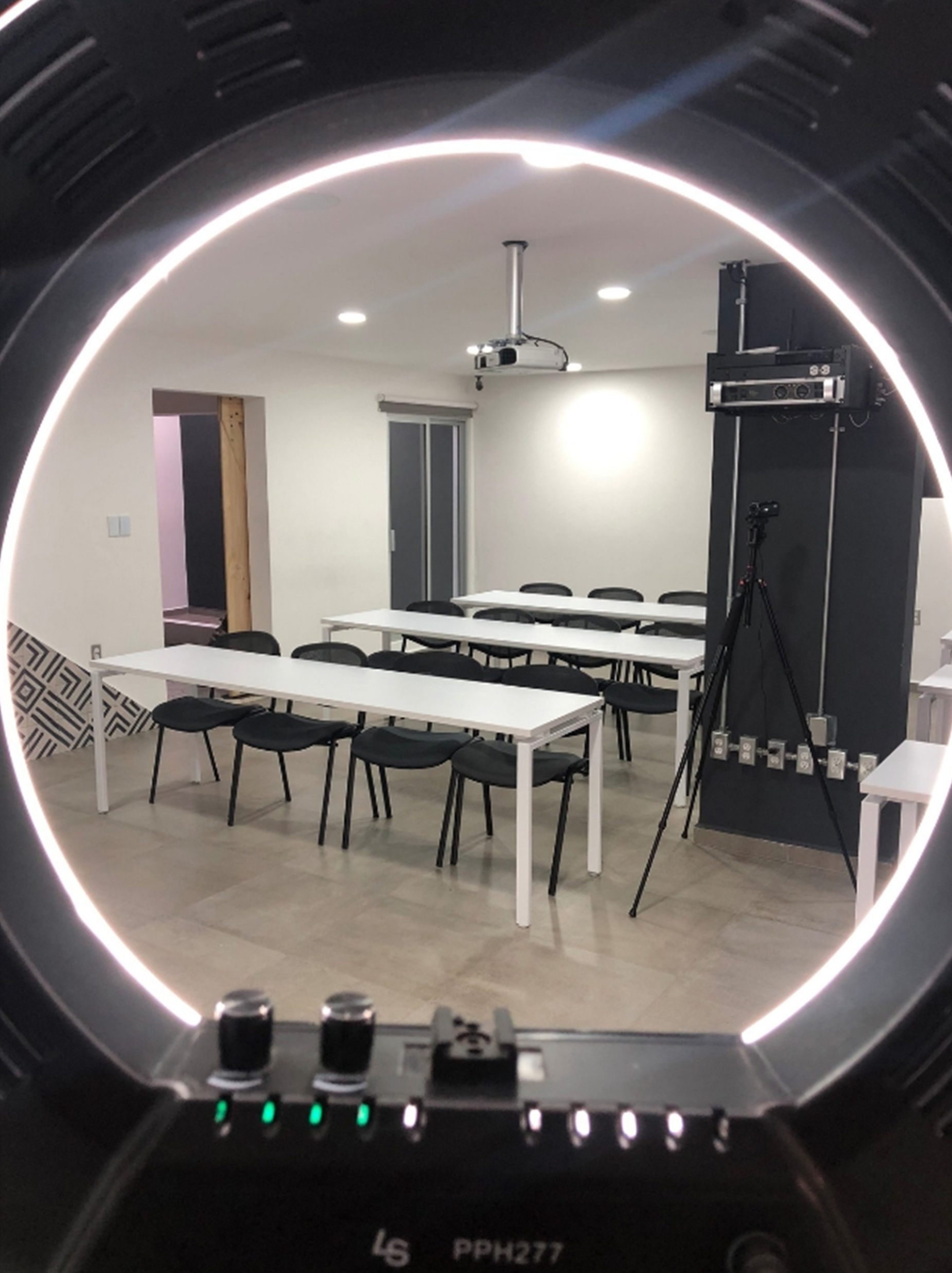 Pantalla de proyección, audio, micrófono tipo diadema, video cámara para transmisión a